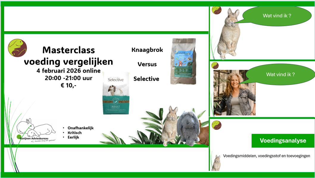 Vraagt u zich weleens af hoe u verschillende konijnenbrokken op een duidelijke en objectieve manier kunt vergelijken? Tijdens de Masterclass Voeding Vergelijken gaan we de brokken van Science Selective en de Knaagbox vergelijken.